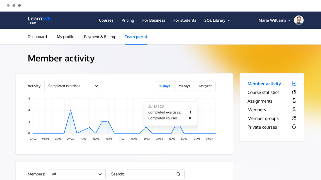 Le ofrecemos el Portal de Enseñanza, que le ayudará a lograr sus objetivos educativos, a realizar un seguimiento del progreso de sus alumnos e, incluso, a crear sus propios cursos de SQL.